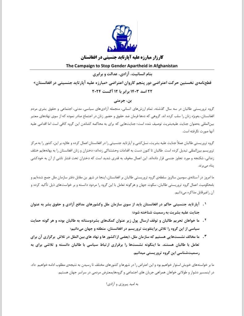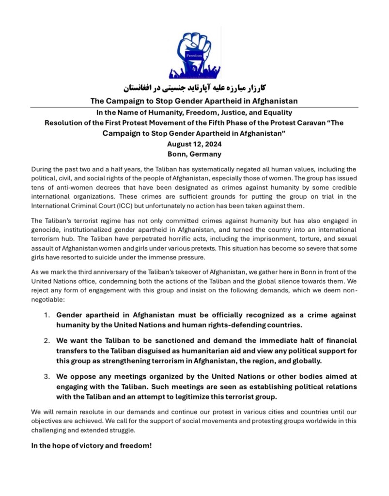 Resolution of the First Protest Movement of the Fifth Phase of the Protest Caravan “TheCampaign to Stop Gender Apartheid in Afghanistan”
